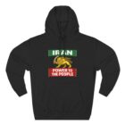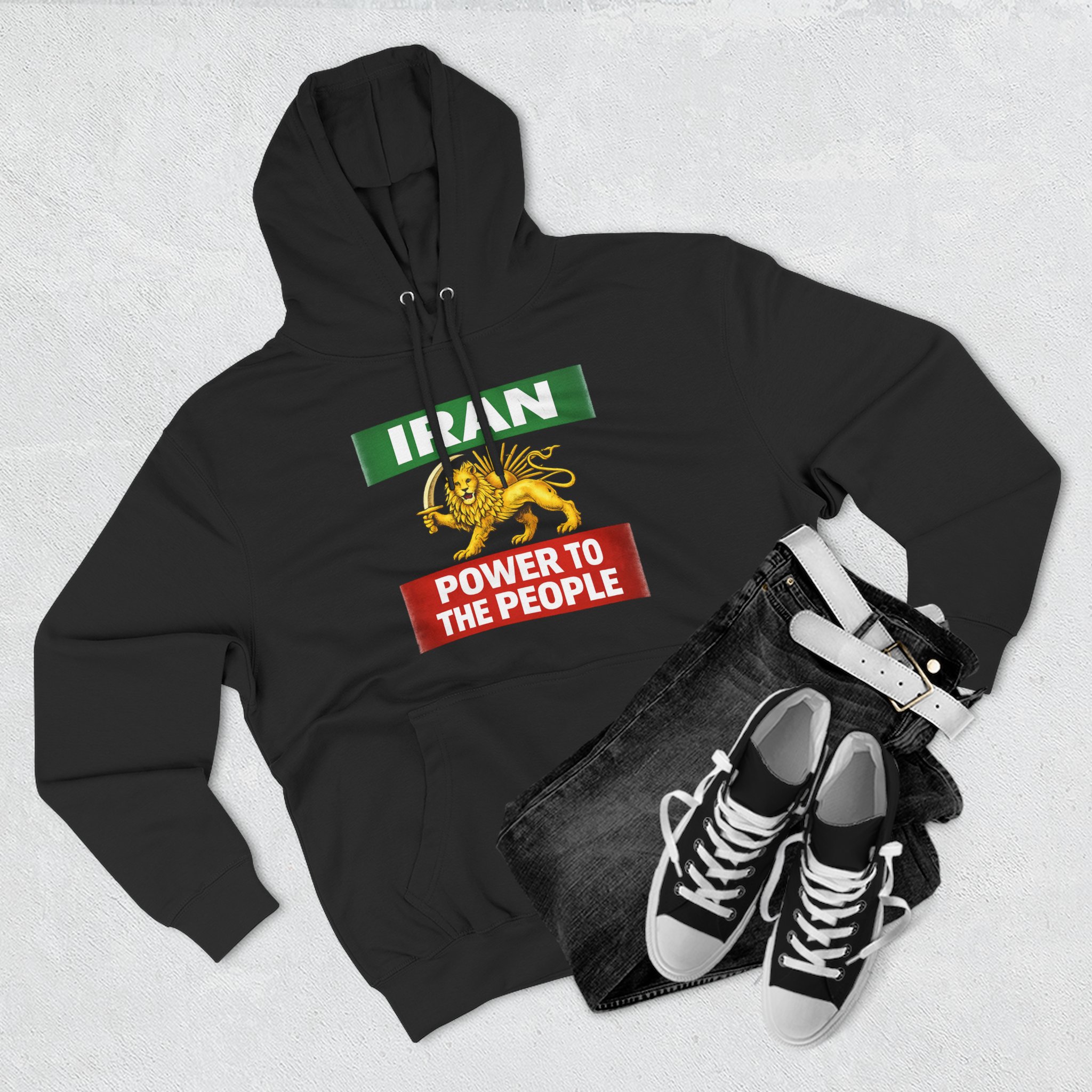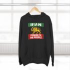This heavyweight hoodie carries quiet authority. The front features a bold, vintage-inspired emblem in green, gold, and red — a banner reading “IRAN” above a stylized lion, with a striking red panel below stating “POWER TO THE PEOPLE.” The design sits centered over a roomy kangaroo pocket, the adjustable hood framed by self-colored drawstrings and metal grommets. Inside, soft 3-end fleece and a medium-heavy fabric weight give it a substantial, lived-in feel that warms without feeling bulky. Subtle details — twill neck tape, double-needle topstitching, and the option for chest embroidery — speak to durability and thoughtful construction. Wear it to quietly make a statement, to gather with fellow activists, or to keep warm on long nights of planning and conversation.