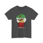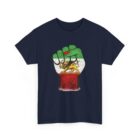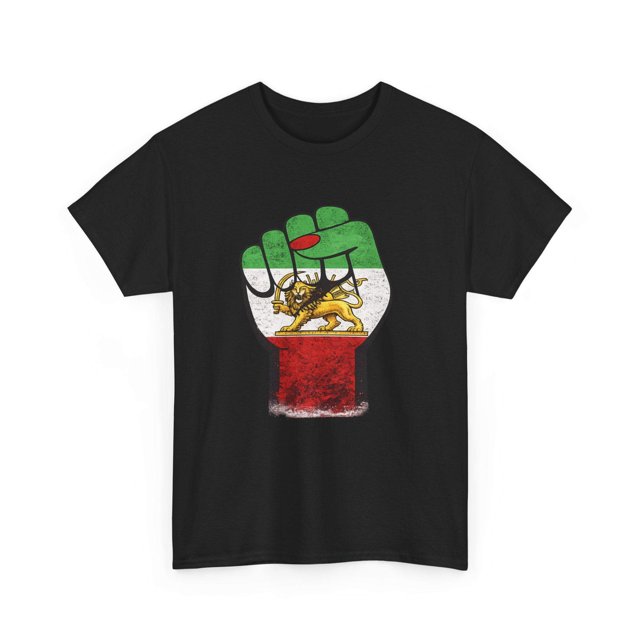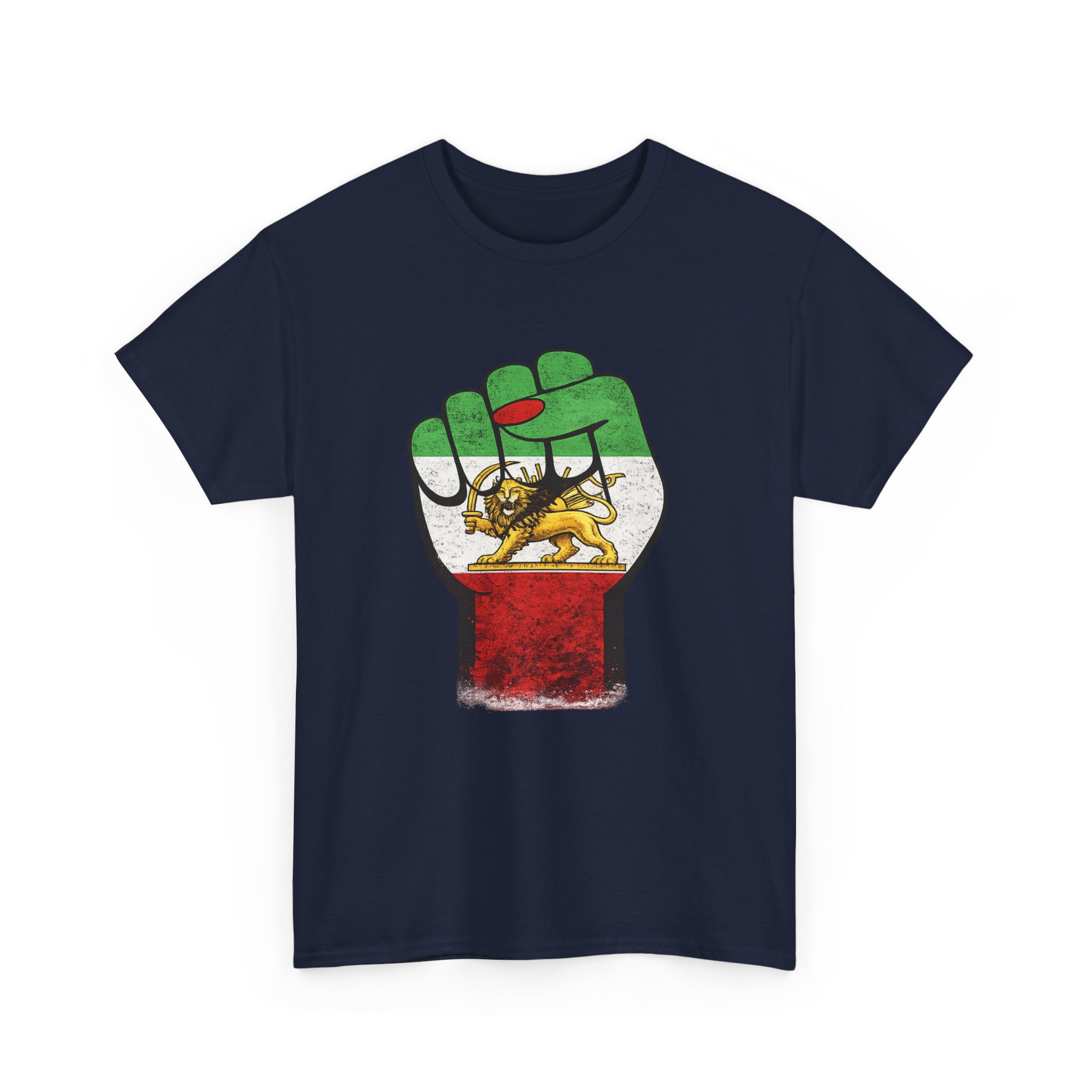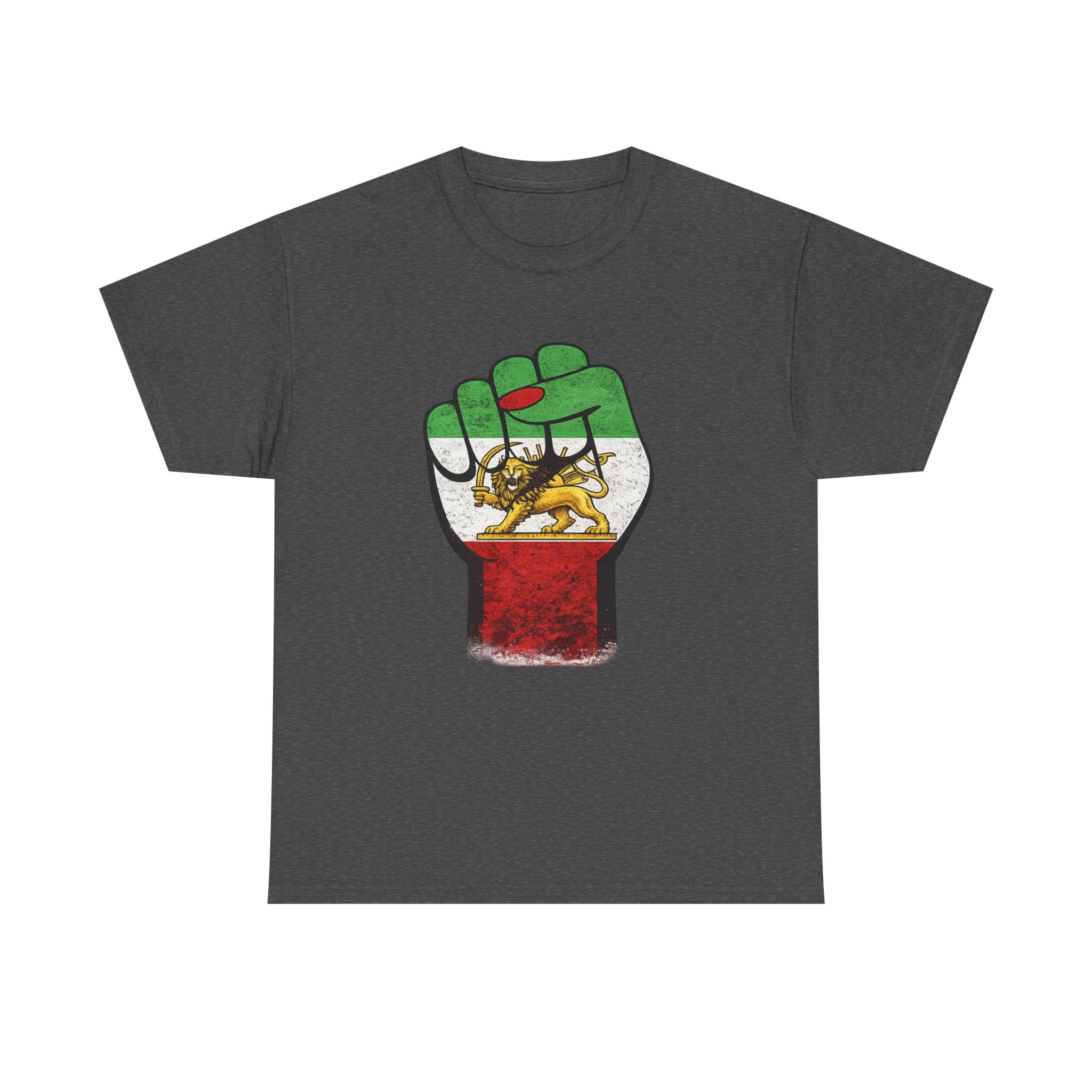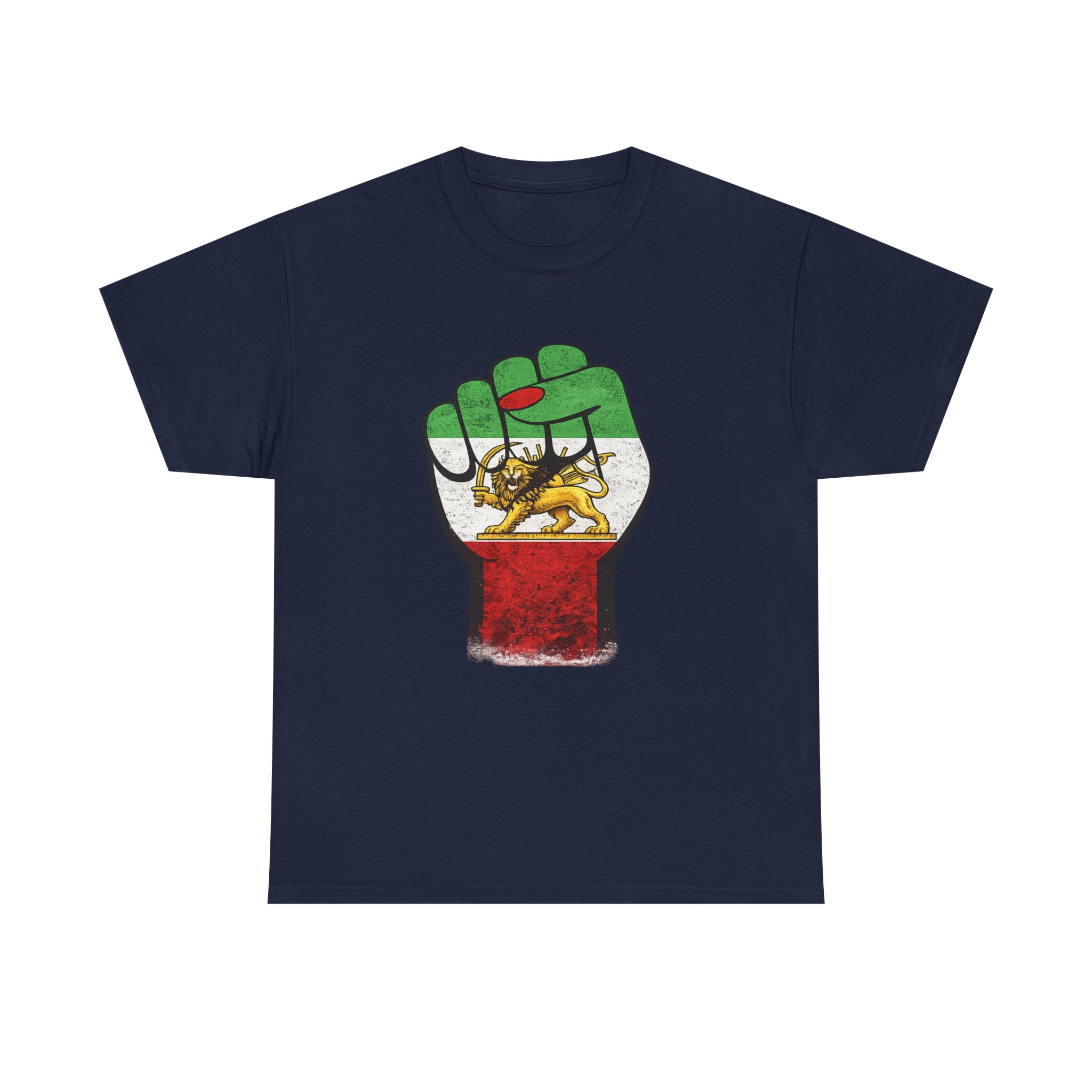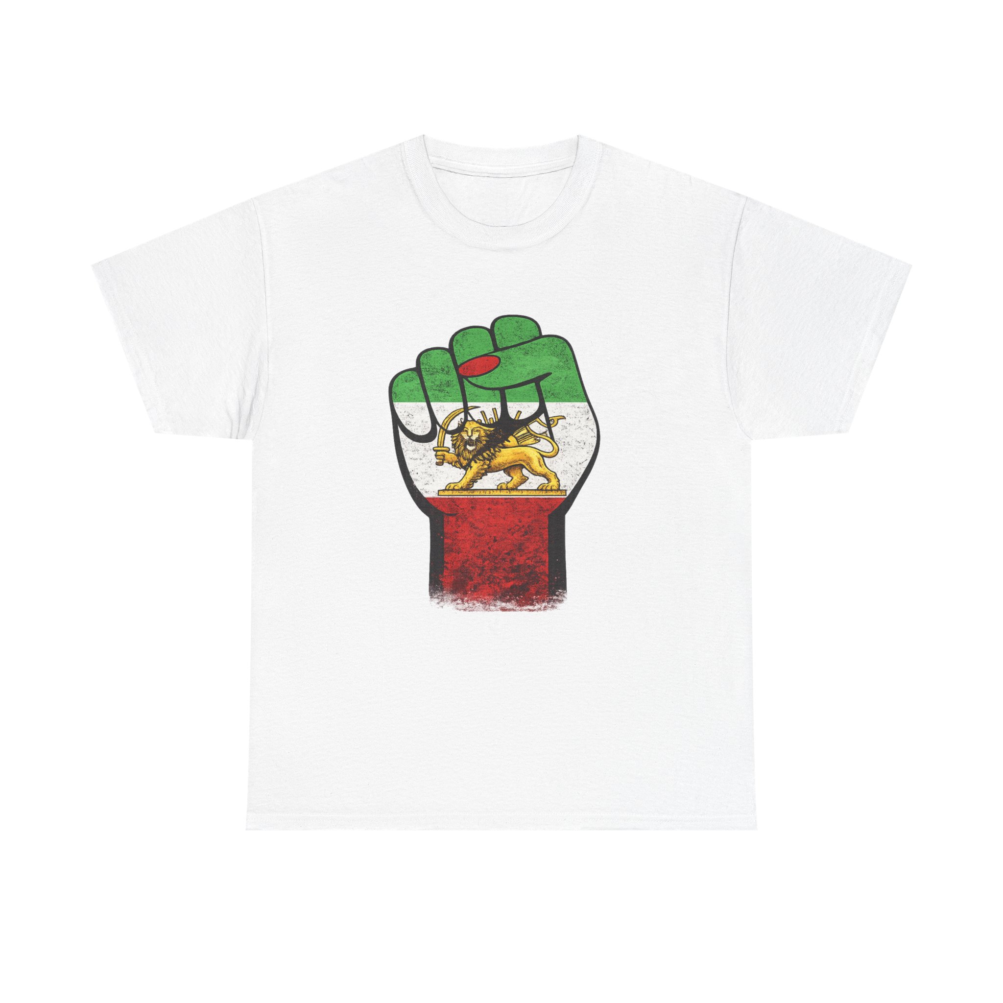 A raised fist draped in the Imperial Iranian flag — the Lion & Sun at its heart. This powerful design represents the unbreakable strength and pride of the Persian people. Premium Gildan 5000 heavyweight cotton tee.